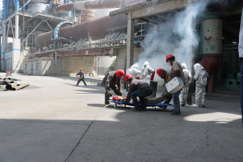 此次演練由生產(chǎn)部主任王克峰擔(dān)任救援總指揮,并設(shè)立安全警戒、水電控制、消防滅火、疏散搶救、醫(yī)療救護、后勤保障共6個救援小組,并設(shè)專人任組長。上午9:30分,全體演練人員在燒成車間窯中空場進行集合。王克峰總指揮首先進行了演練動員,宣布了本次演練的組織機構(gòu)人員名單、職責(zé)及演練要求。隨著王克峰宣布演練正式開始,各組人員嚴格按照救援方案展開演練。安全警戒組和水電控制組立即設(shè)立警戒帶和切斷災(zāi)情區(qū)域及相關(guān)設(shè)施電源,消防滅火組迅速用滅火器對火災(zāi)現(xiàn)場進行緊急滅火,疏散搶救組將災(zāi)區(qū)人員的重要物資進行轉(zhuǎn)移并將傷員救出,隨后醫(yī)療救護小組在現(xiàn)場對傷員進行了緊急救治,后勤保障組提供各項服務(wù)支持。各救援小組分工明確,反應(yīng)迅速,配合緊密,僅用了5分鐘便成功撲滅火災(zāi)將人員救出,在大家共同努力下此次演練圓滿成功。