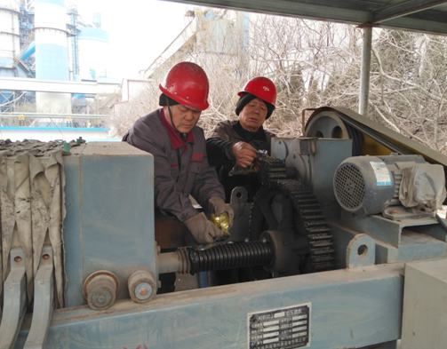 輸煤崗位的老員工劉成軍、白光文正在為壓濾機加注潤滑油