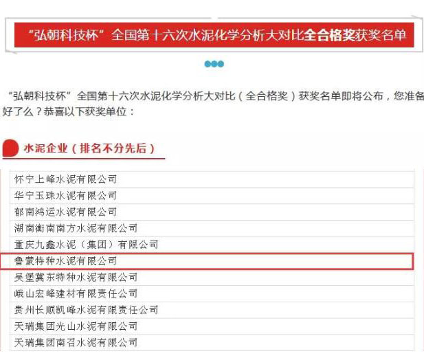 魯蒙水泥榮獲全國(guó)第十六次化學(xué)分析大對(duì)比“全合格”獎(jiǎng)項(xiàng)