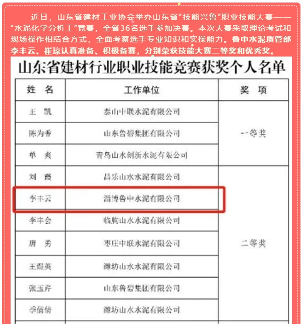【榮譽(yù)】魯中水泥李豐云、崔瓊榮獲“技能興魯”技能大賽二等獎(jiǎng)和優(yōu)秀獎(jiǎng)