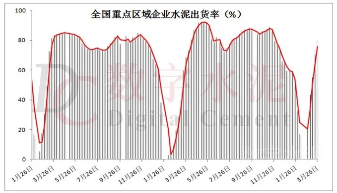 三月下旬,隨著天氣好轉(zhuǎn),建筑工程和攪拌站開(kāi)工率明顯提升,水泥需求也得以迅速恢復(fù)。據(jù)數(shù)字水泥網(wǎng)監(jiān)測(cè)出貨率數(shù)據(jù)顯示,本周全國(guó)重點(diǎn)區(qū)域水泥企業(yè)平均出貨率為81%,環(huán)比增加10個(gè)百分點(diǎn)。分區(qū)域看,華東、華南地區(qū)需求恢復(fù)較好,企業(yè)出貨率均達(dá)到九成以上或正常水平,個(gè)別區(qū)域?qū)崿F(xiàn)銷(xiāo)大于產(chǎn);華北、華中和西南地區(qū)下游需求保持穩(wěn)步回升,出貨率分別為76%、84%和85%,環(huán)比前期增加5%-10%;東北和西北地區(qū)受制于天氣因素,下游需求整體恢復(fù)略顯靠后,本周平均出貨率為40%和64%。