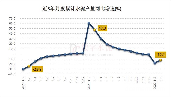 2022年一季度,全國累計水泥產(chǎn)量3.87億噸,同比下降12.1%,降幅較1-2月收窄5.7個百分點,去年同期為增長47.3%;3月份,全國單月水泥產(chǎn)量1.87億噸,同比下降5.6%,但仍處于2018年以來同期次好水平。
