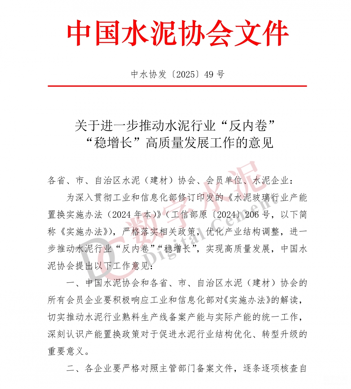 【轉載】中國水泥協(xié)會:關于進一步推動水泥行業(yè)“反內卷”“穩(wěn)增長”高質量發(fā)展工作的意見