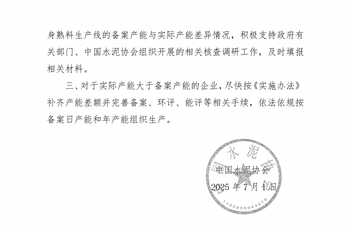 二、各企業(yè)要嚴格對照主管部門備案文件,逐條逐項核查自身熟料生產(chǎn)線的備案產(chǎn)能與實際產(chǎn)能差異情況,積極支持政府有關部門、中國水泥協(xié)會組織開展的相關核查調研工作,及時填報相關材料。