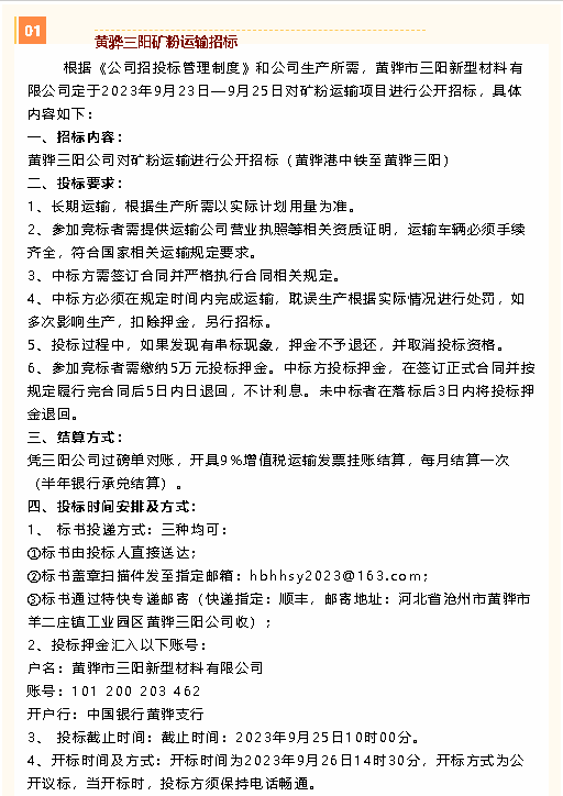 【招標(biāo)公告】黃驊三陽(yáng)礦粉運(yùn)輸、熟料運(yùn)輸、石子招標(biāo)