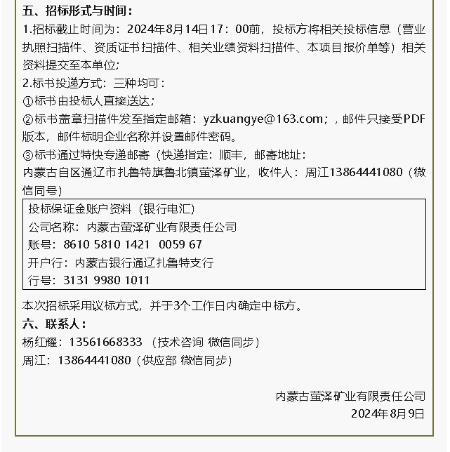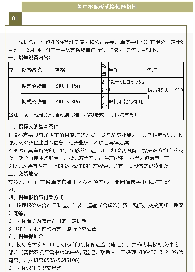【招標(biāo)公告】魯中水泥板式換熱器、螢澤礦業(yè)油酸招標(biāo)