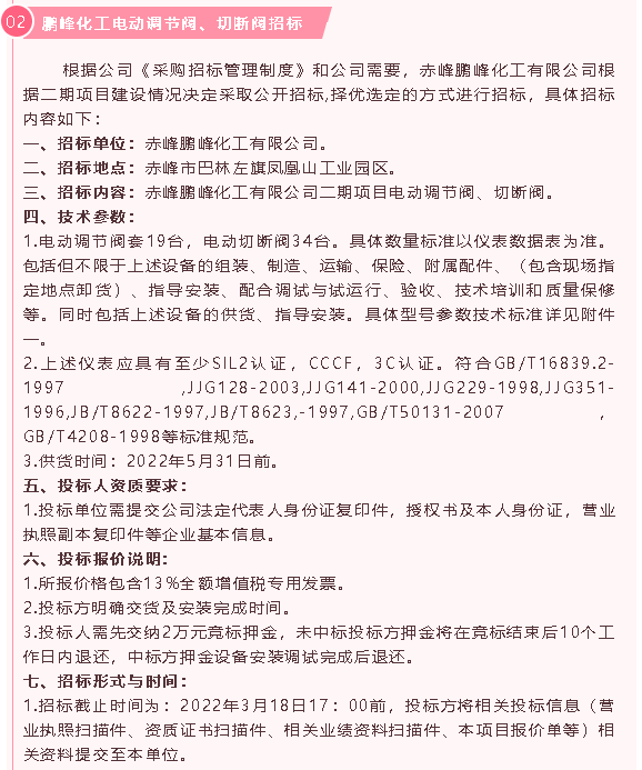 【招標(biāo)公告】鵬峰化工低壓配電柜、電動調(diào)節(jié)閥、切斷閥招標(biāo)