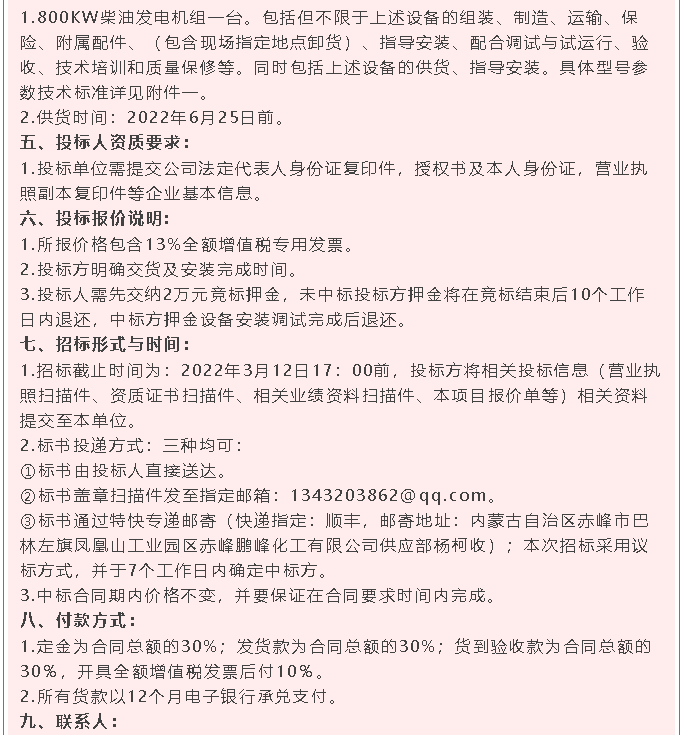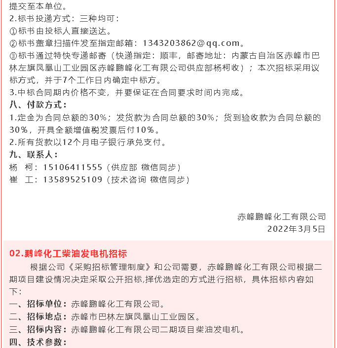 【招標公告】鵬峰化工稱重儀表、柴油發(fā)電機、干式變壓器招標