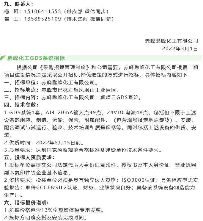 【招標(biāo)公告】 鵬峰化工SIS安全儀表、DCS系統(tǒng)、SIS系統(tǒng)、GDS系統(tǒng)、有毒有害氣體報(bào)警器招標(biāo)