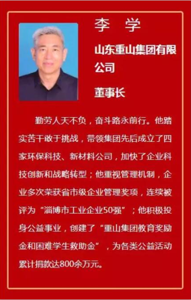 在改革開放40周年之際,為貫徹落實中共中央、國務院《關于營造企業(yè)家健康成長環(huán)境弘揚優(yōu)秀企業(yè)家精神更好發(fā)揮企業(yè)家作用的意見》,淄博市企業(yè)聯(lián)合會、市企業(yè)家協(xié)會組織開展淄博市優(yōu)秀企業(yè)家評選活動,按照“創(chuàng)新力、影響力、貢獻力”原則,綜合考量企業(yè)家在區(qū)域發(fā)展、行業(yè)領軍、社會責任等方面的貢獻,經過材料審核、專家實地考察、專家組討論打分、評審等嚴格的程序之后,于近日公布了名單。重山集團董事長李學榜上有名,彰顯了重山集團在經濟社會發(fā)展中的風采,體現(xiàn)了李學董事長誠信、務實、創(chuàng)新的優(yōu)秀企業(yè)家精神。