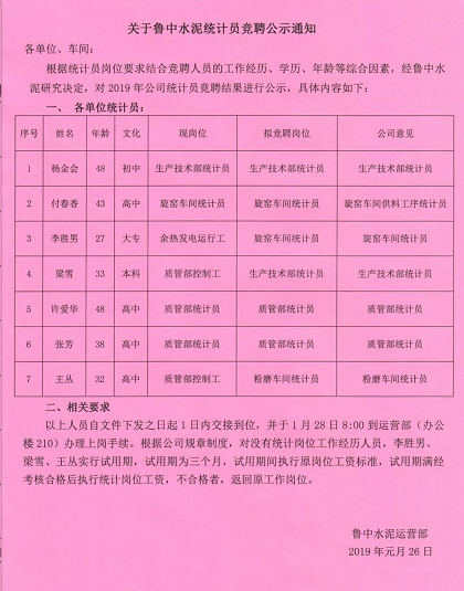 魯中水泥組織統(tǒng)計員崗位競聘