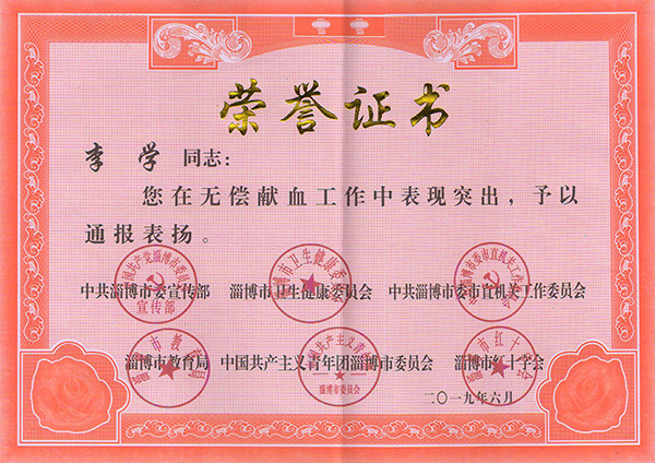 祝賀集團公司和李學(xué)董事長榮獲市無償獻血榮譽