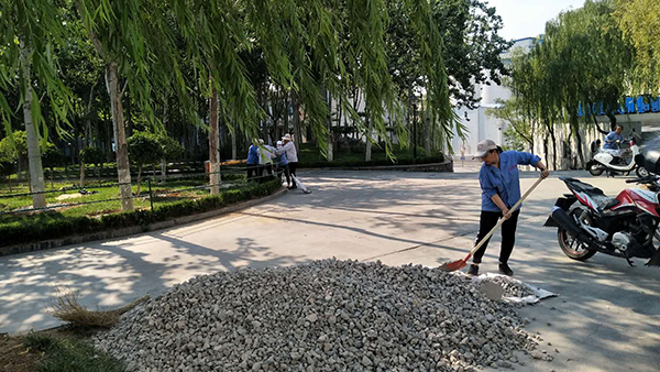 隨著高溫酷暑季節(jié)到來,為保持綠化區(qū)樹穴澆灌水不流失,6月23日,物資部經(jīng)理張娟聯(lián)系供料車間運(yùn)來石子和土,物資部眾姐妹紛紛拿起工具,頂著烈日行動(dòng)起來,大家分工合作,卸車、運(yùn)輸,為每個(gè)樹穴填土、鋪石子,歷經(jīng)一天的時(shí)間,為綠化帶的樹木穿上了一層美麗的嫁衣。