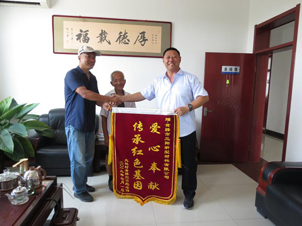 7月3日上午,大趙村主任王志恒同黃驊紀念館工作人員一行4人將一面“愛心奉獻、傳承紅色基因”的錦旗送到黃驊三陽總經理王軍林的手上,感謝他們?yōu)辄S驊紀念館的捐贈。王軍林總經理接過錦旗,深情地說:“吃水不忘打井人,我們始終牢記革命先烈立下的豐功偉業(yè),感恩黨給我們帶來的幸福生活,我們重山人崇尚像黃驊將軍這樣的民族英雄,今后將與黃驊紀念館加強溝通,作為今后公司黨建教育的重要基地,對于紀念館盡微薄之力是應該的?!蓖踔竞阒魅伪硎緦S驊三陽的愛心奉獻非常感謝,熱烈歡迎黃驊三陽經常性到紀念館參觀,為紀念館的建設提出寶貴意見,將紅色文化發(fā)揚光大。