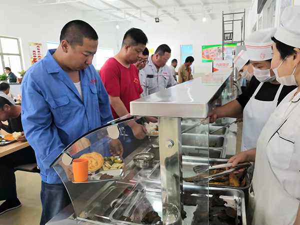 重裝后的食堂桌椅整齊、環(huán)境干凈整潔、布置舒適溫馨、菜色新鮮、品類豐富,以自助餐和半自助餐等形式就餐,不僅滿足了生活區(qū)職工和熱電廠、供料等單位員工的就餐需求,同時也為各類送貨司機和施工人員提供了就餐便利,用實際行動踐行了致良知思想,真正做到了“為員工謀福祉”。