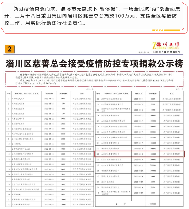 山東重山集團(tuán)捐款100萬(wàn)元支援淄川疫情防控