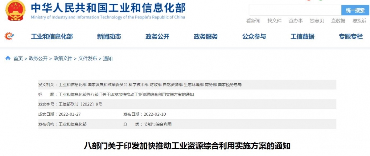工業(yè)和信息化部、國家發(fā)展和改革委員會、科學(xué)技術(shù)部、財政部、自然資源部、生態(tài)環(huán)境部、商務(wù)部、國家稅務(wù)總局等八部門近日聯(lián)合印發(fā)《關(guān)于加快推動工業(yè)資源綜合利用的實施方案》,明確到2025年,鋼鐵、有色、化工等重點行業(yè)工業(yè)固廢產(chǎn)生強度下降,大宗工業(yè)固廢的綜合利用水平顯著提升,再生資源行業(yè)持續(xù)健康發(fā)展,工業(yè)資源綜合利用效率明顯提升。力爭大宗工業(yè)固廢綜合利用率達(dá)到57%,其中,冶煉渣達(dá)到73%,工業(yè)副產(chǎn)石膏達(dá)到73%,赤泥綜合利用水平有效提高。主要再生資源品種利用量超過4.8億噸,其中廢鋼鐵3.2億噸,廢有色金屬2000萬噸,廢紙6000萬噸。工業(yè)資源綜合利用法規(guī)政策標(biāo)準(zhǔn)體系日益完善,技術(shù)裝備水平顯著提升,產(chǎn)業(yè)集中度和協(xié)同發(fā)展能力大幅提高,努力構(gòu)建創(chuàng)新驅(qū)動的規(guī)模化與高值化并行、產(chǎn)業(yè)循環(huán)鏈接明顯增強、協(xié)同耦合活力顯著激發(fā)的工業(yè)資源綜合利用產(chǎn)業(yè)生態(tài)。