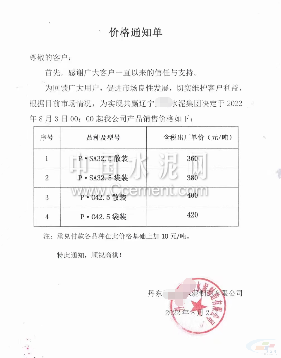 受停窯帶動(dòng),加之企業(yè)調(diào)價(jià)意愿強(qiáng)烈,8月2日起省內(nèi)一些主要廠家開(kāi)始嘗試通知上調(diào)水泥價(jià)格20元/噸左右。目前已有部分企業(yè)發(fā)布調(diào)漲通知,其余企業(yè)預(yù)計(jì)稍晚幾日跟進(jìn)。