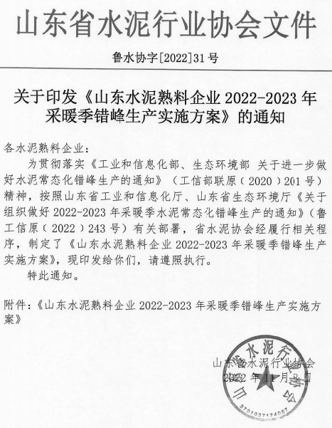 11月8日,山東省工業(yè)和信息化廳,生態(tài)環(huán)境廳發(fā)布《山東省工業(yè)和信息化廳山東省生態(tài)環(huán)境廳關于組織做好2022-2023年采暖季水泥常態(tài)化錯峰生產的通知》(魯工信原[2022]243號),《通知》中要求全省水泥熟料企業(yè)的所有熟料生產線(含特種水泥熟料生產線)在2022年11月15日0:00-2023年3月15日24:00進行錯峰生產。