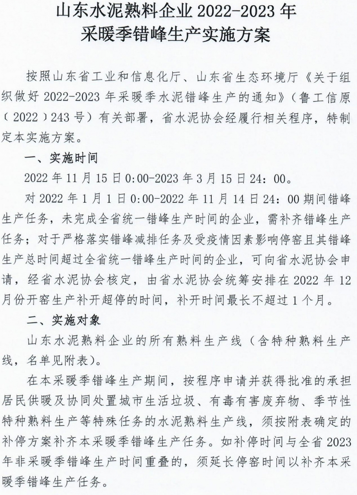 【轉載】山東:2022-2023年冬春季全省水泥熟料企業(yè)共錯峰生產120天