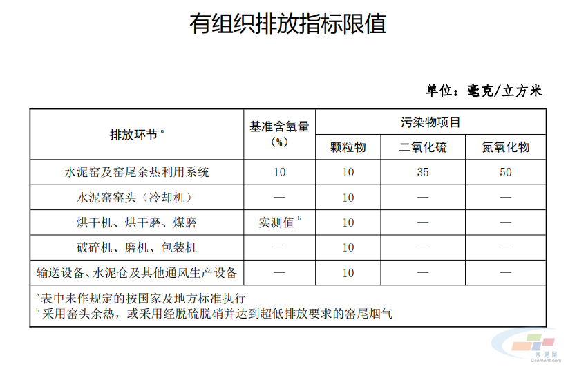 征求意見稿提到了有組織排放指標要求,在基準含氧量10%的條件下,水泥窯及窯尾余熱利用系統(tǒng)煙氣顆粒物、二氧化硫、氮氧化物排放濃度小時均值分別不高于10、35、50mg/m3。達到超低排放的水泥企業(yè)每月生產時間至少95%以上時段小時均值排放濃度滿足上述要求。