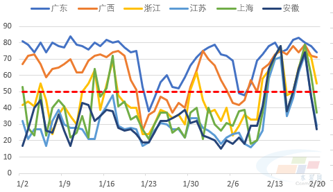 盡管今年市場漲價(jià)期比以往來得更早一些,但漲價(jià)的驅(qū)動(dòng)力在供應(yīng)端,目前工人多數(shù)尚未返工,需求仍未啟動(dòng),需求依然羸弱,漲價(jià)基礎(chǔ)并不牢固。中國水泥網(wǎng)水泥大數(shù)據(jù)顯示,珠三角地區(qū)施工指數(shù)較高,施工條件適宜,而華東主要地區(qū)目前仍不適合施工。根據(jù)中國氣象臺(tái)數(shù)據(jù),2月底前長三角地區(qū)雨水天氣居多,北方地區(qū)氣溫偏低,市場整體難有起色。3月份南方地區(qū)隨著氣溫回暖,預(yù)計(jì)需求率先恢復(fù),但北方地區(qū)仍然滯后,加之“兩會(huì)”召開及項(xiàng)目部署和資金落地需要時(shí)間,預(yù)計(jì)今年一季度市場壓力較大。
