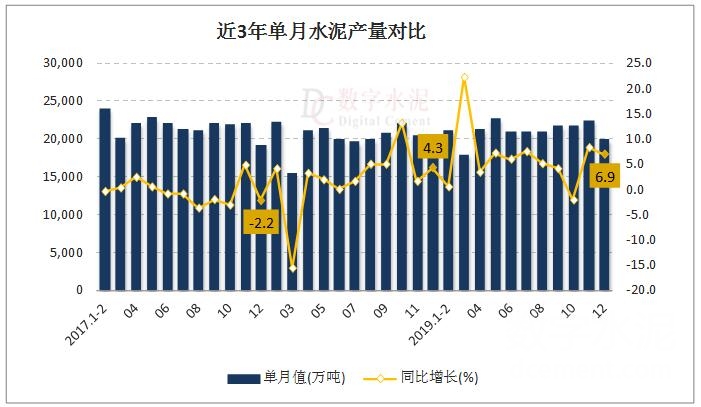 2019年,全國累計水泥產(chǎn)量23.3億噸,同比增長6.1%,增速較去年同期提高3.1個百分點,與1-11月增速持平。2019年12月,全國單月水泥產(chǎn)量1.99億噸,同比增長6.9%,增速較去年同期提高2.6個百分點,環(huán)比下降11.35%。