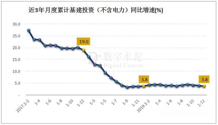2019年,全國基礎設施投資(不含電力)同比增長3.8 %,增速較1-11月回落0.2個百分點,與去年同期增速持平。其中,鐵路運輸業(yè)投資下降0.1%,1-11月份為增長1.6%;道路運輸業(yè)投資增長9.0%,增速較1-11月加快0.2個百分點;水利管理業(yè)投資增長1.4%,增速較1-11月回落0.3個百分點。