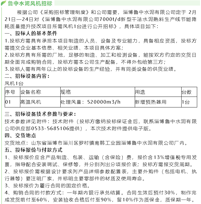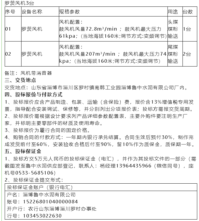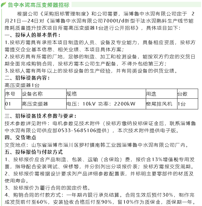 【招標(biāo)公告】魯中水泥羅茨風(fēng)機(jī)、高壓變頻器、提升機(jī)、風(fēng)機(jī)招標(biāo)