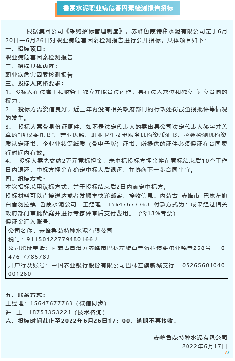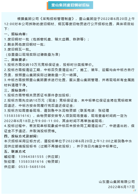 【招標(biāo)公告】重山集團(tuán)廢舊鋼材招標(biāo)、魯蒙水泥職業(yè)病危害因素檢測(cè)報(bào)告招標(biāo)