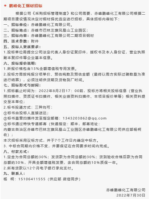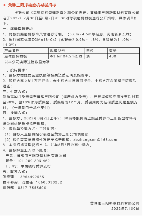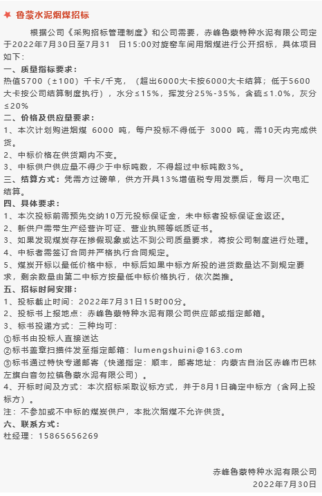 【招標(biāo)公告】魯蒙水泥煙煤,黃驊三陽(yáng)球破磨機(jī)襯板、袋裝水泥編織袋,鵬峰化工鋼材招標(biāo)