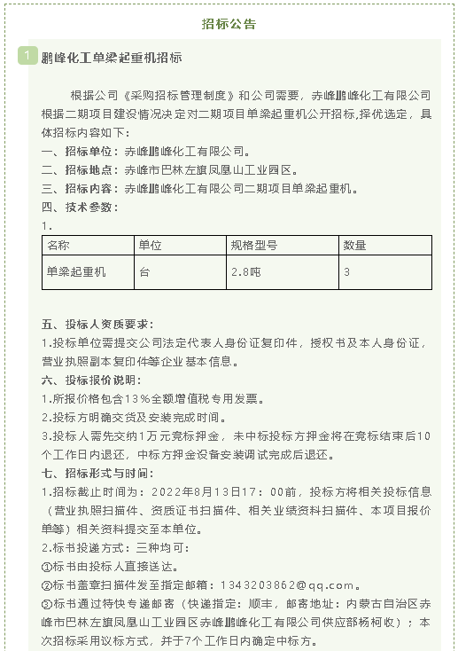 【招標(biāo)公告】鵬峰化工單梁起重機(jī)、導(dǎo)氣管、載冷劑原液招標(biāo)