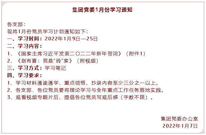 【通知】集團黨委1月份學(xué)習(xí)通知