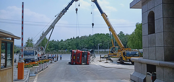 6月22日,正值大家正常工作的時間,一聲巨響打破了工作的寧靜。102省道由東往西的一輛河北籍重型卡車為躲避突然掉頭的車輛向公司正門西側猛沖過來,緊急的剎車讓車輛瞬間傾翻在地,滿載的數(shù)十噸石灰灑落一地。集團總務處主任王宏得知消息立即向前查看詳情,側翻造成了駕駛室嚴重變形,貨車司機被困其中,無法動彈,傷勢不明。安保隊員陳萬鵬在第一時間撥打了120救助電話。怎樣把受傷人員從側翻變形的駕駛室中迅速救出來成了首先解決的難題。側翻的駕駛室目測有兩米高,需要搭梯才能進入朝天的車門,時間不等人,早一分鐘救出傷員,他們的生命就少一份危險,安保人員用被撞壞的欄桿代替腳梯,由兩名值班門衛(wèi)扶著欄桿,陳萬鵬爬梯救人。頂著烈日,他不懼困難、奮力施救,汗水一滴一滴從頭上落下,侵透了衣衫,他顧不上抹去刺痛眼睛的汗水,心里只想著盡快把傷員救出。因為貨車司機體型偏胖,又被方向盤牢牢的卡住,為了避免貨車司機受到二次傷害,只能利用現(xiàn)有的空間慢慢把傷員往上拖,經(jīng)過半個多小時的時間終于把貨車司機順利救出,120醫(yī)護人員立即將他送往醫(yī)院進行救助。隨后,王宏、王立群協(xié)調(diào)粉磨車間的宋濤、供料車間的王新剛等單位領導分別帶領部分職工和兩臺裝載車在現(xiàn)場待命,救出傷員后清理現(xiàn)場;協(xié)調(diào)的兩臺吊車待傷員救助后將側翻貨車吊起扶正,同時安保人員疏導現(xiàn)場交通,確保102省道和公司正門的交通安全。下午1:30左右,灑落的石灰清理完畢、側翻的貨車成功吊起扶正。救援結束后正值午時,王宏安排兩名駕駛員到職工食堂就餐,細致入微的照顧讓兩名駕駛員感動不已。身在異鄉(xiāng)的謀生者感到了如親人般的溫暖,他們激動的握著王宏的雙手,表示真心的感謝。不善言談的貨車司機在晚上給王宏發(fā)了微信紅包,并對重山集團的這次義務救援表示深深的感謝,王宏婉言謝絕了他的好意,向他表示:我們重山人做事都要對得起自己的良知,不求任何回報的。這是我們應該做的。用實際行動詮釋了致良知思想的內(nèi)涵和意義,充分體現(xiàn)了重山集團的社會擔當和致力構建和諧社會的決心。